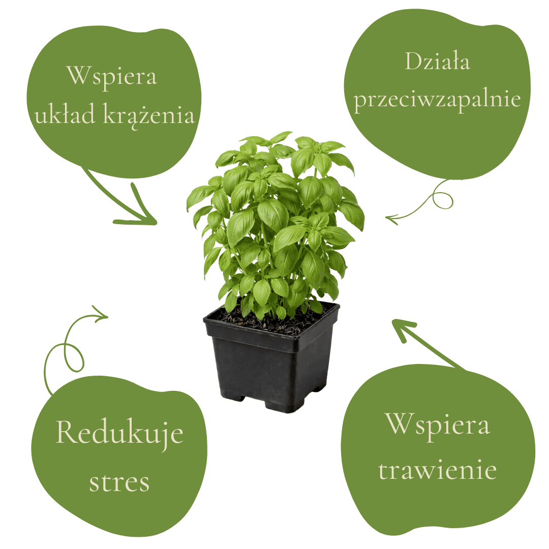 Bazylia jest tradycyjnie stosowana jako zioło, które może sprzyjać komfortowi po jedzeniu i lekkości w codziennym trawiennym rytmie. Jej intensywny aromat bywa pomocny, gdy potrzebujesz odświeżenia i przyjemnego „pobudzenia” zmysłów, zwłaszcza w kuchni. Najczęściej wybiera się ją jako łagodne wsparcie codziennego komfortu i dobrego samopoczucia po posiłkach.