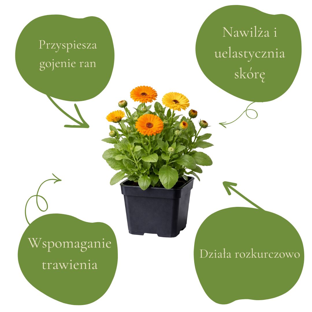 Nagietek lekarski jest tradycyjnie stosowany jako zioło, które może sprzyjać komfortowi skóry i jej naturalnej równowadze, zwłaszcza gdy zależy nam na łagodnej, codziennej pielęgnacji. W domowej praktyce bywa też wybierany jako delikatne wsparcie trawienia, kiedy chcemy po posiłku poczuć więcej lekkości i spokoju. Najmocniej kojarzy się z łagodnym wsparciem skóry — w prostych maściach, olejach i ziołowych wodach.